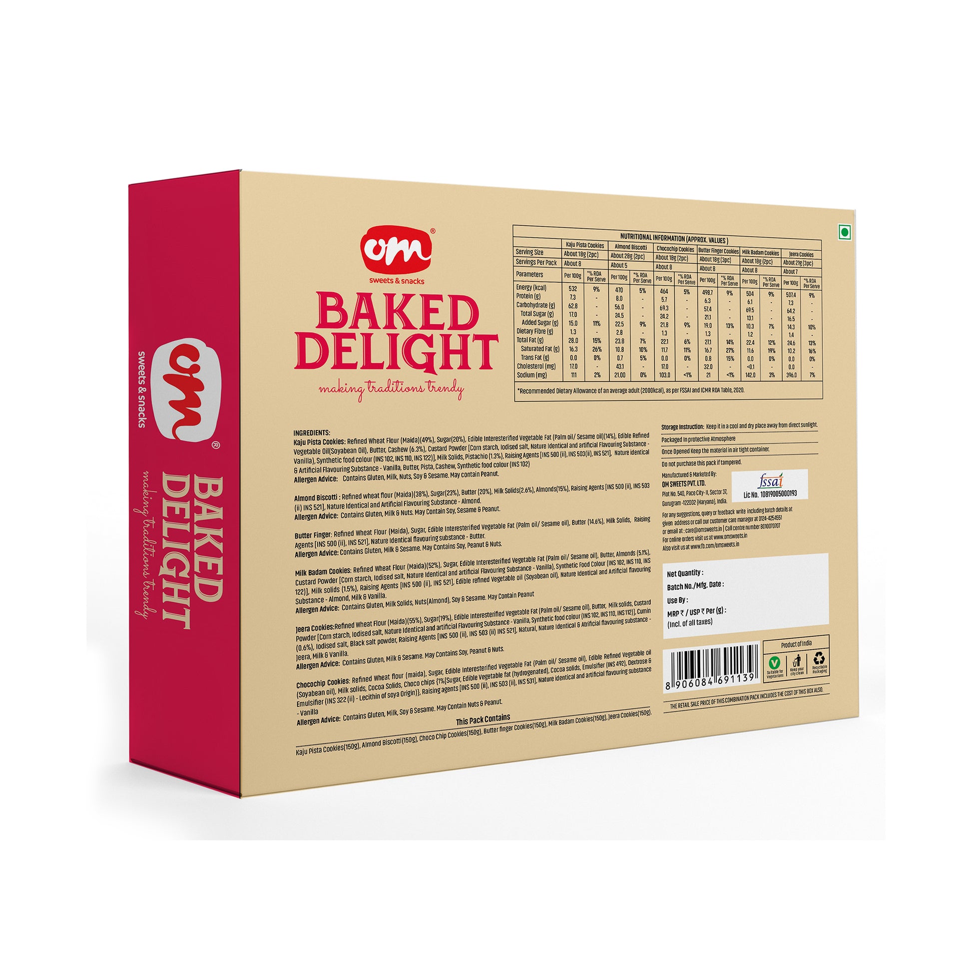 A premium assortment of Almond Biscotti, Kaju Pista Cookies, Jeera Cookies, Butter Finger Cookies, Choco Chips Cookies and Milk Badam Cookies (6 × 150g), perfect for gifting and everyday indulgence.