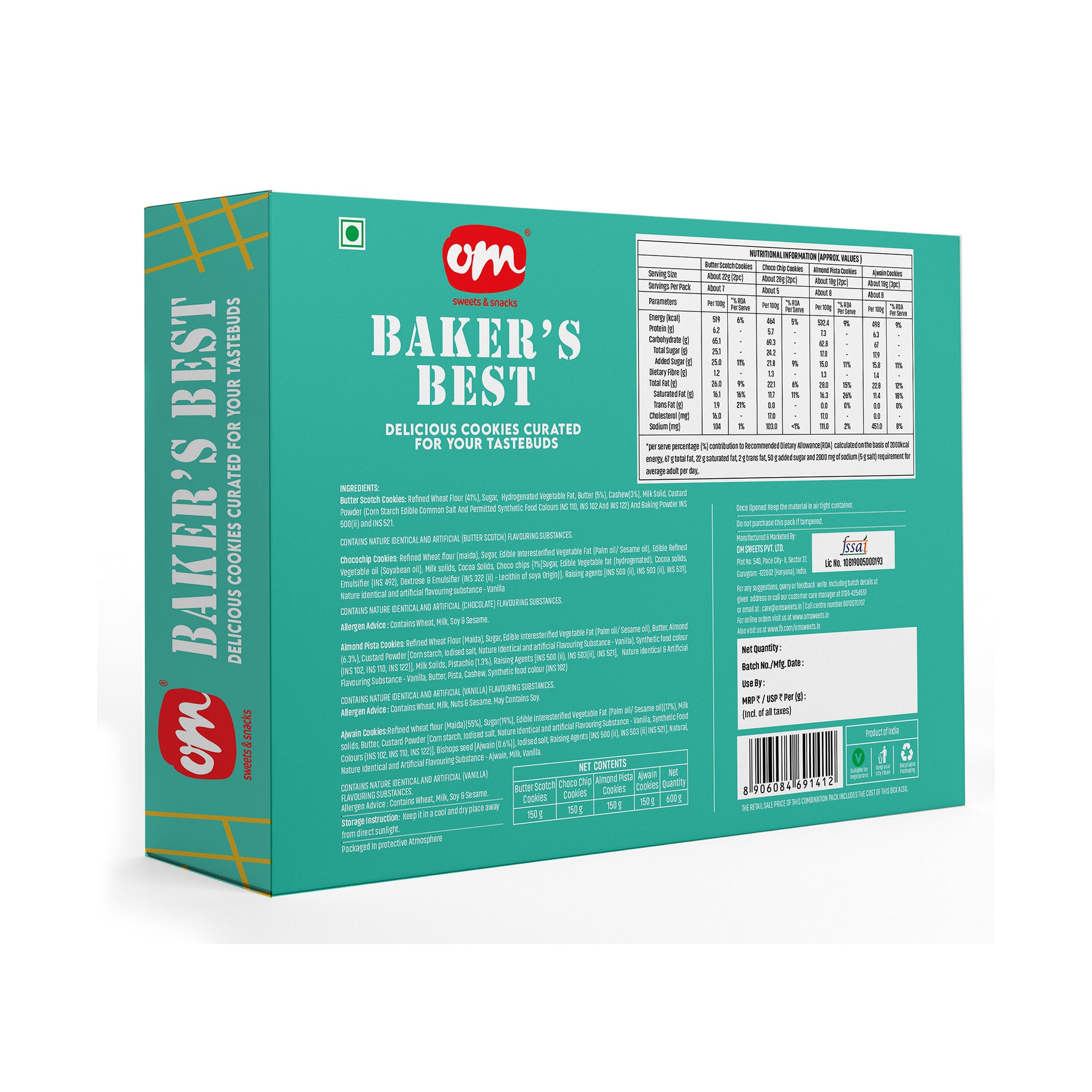 Indulge in the perfect assortment of premium cookies – a curated selection featuring choco chips cookies 150g, almond pista 150g, butter scotch cookies 150g, and ajwain cookies 150g. Made with high-quality refined flour, real butter, premium nuts, and natural flavours.